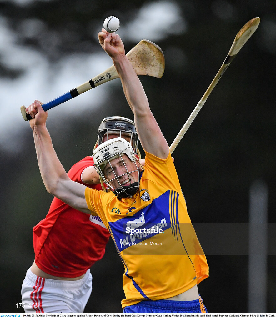 10 July 2019; Aidan Moriarty of Clare in action against Robert Downey of Cork during the Bord Gais Energy Munster GAA Hurling Under 20 Championship semi-final match between Cork and Clare at Páirc Ui Rinn in Cork. Photo by Brendan Moran/Sportsfile