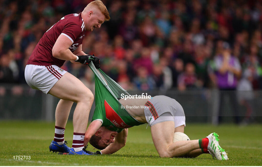6 July 2019; Colm Boyle of Mayo with Sean Andy Ó Ceallaigh of Galway during the GAA Football All-Ireland Senior Championship Round 4 match between Galway and Mayo at the LIT Gaelic Grounds in Limerick. Photo by Brendan Moran/Sportsfile