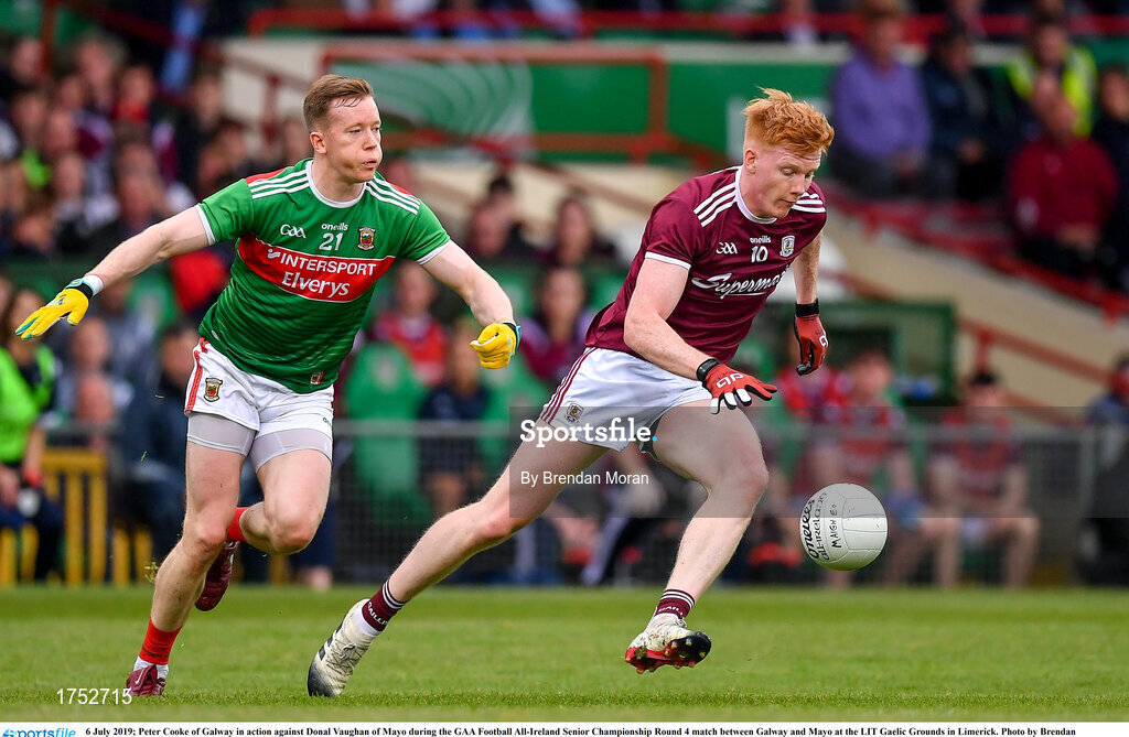 6 July 2019; Peter Cooke of Galway in action against Donal Vaughan of Mayo during the GAA Football All-Ireland Senior Championship Round 4 match between Galway and Mayo at the LIT Gaelic Grounds in Limerick. Photo by Brendan Moran/Sportsfile