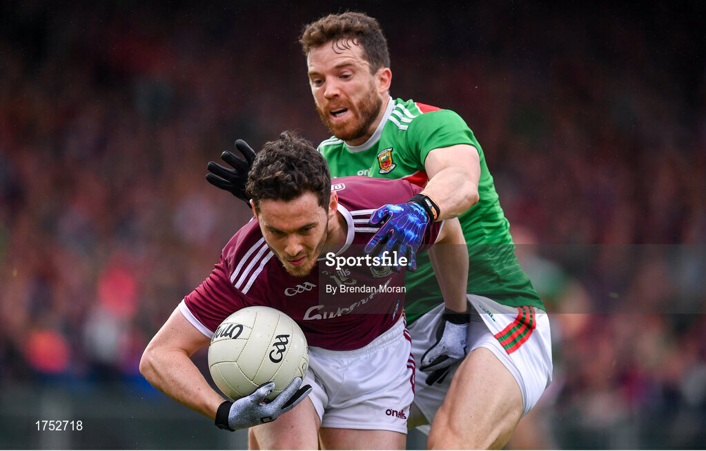 6 July 2019; Ian Burke of Galway in action against Chris Barrett of Mayo during the GAA Football All-Ireland Senior Championship Round 4 match between Galway and Mayo at the LIT Gaelic Grounds in Limerick. Photo by Brendan Moran/Sportsfile