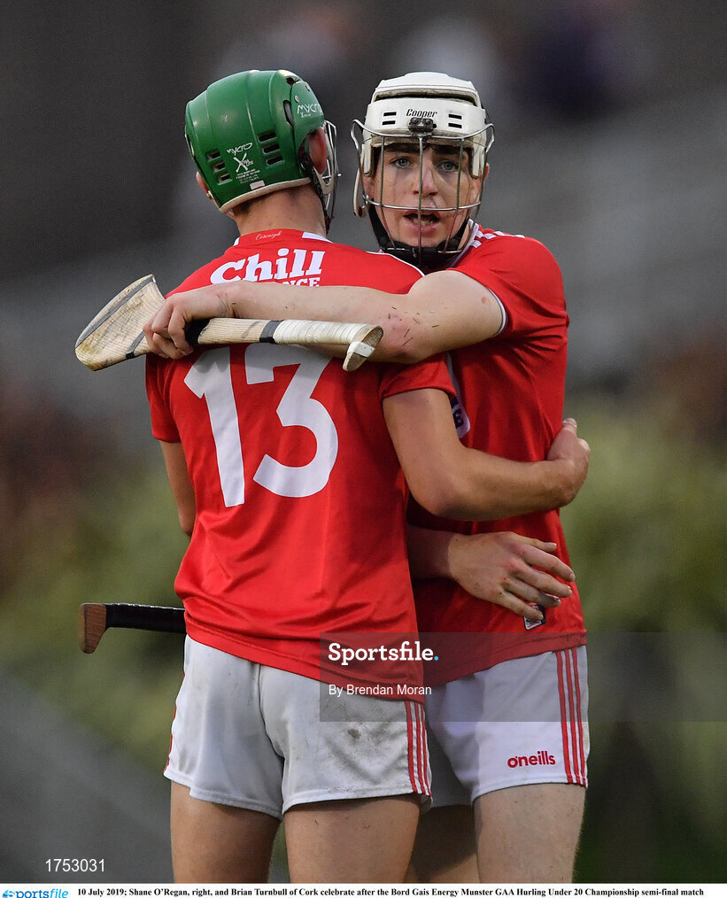 10 July 2019; Shane O’Regan, right, and Brian Turnbull of Cork celebrate after the Bord Gais Energy Munster GAA Hurling Under 20 Championship semi-final match between Cork and Clare at Páirc Ui Rinn in Cork. Photo by Brendan Moran/Sportsfile