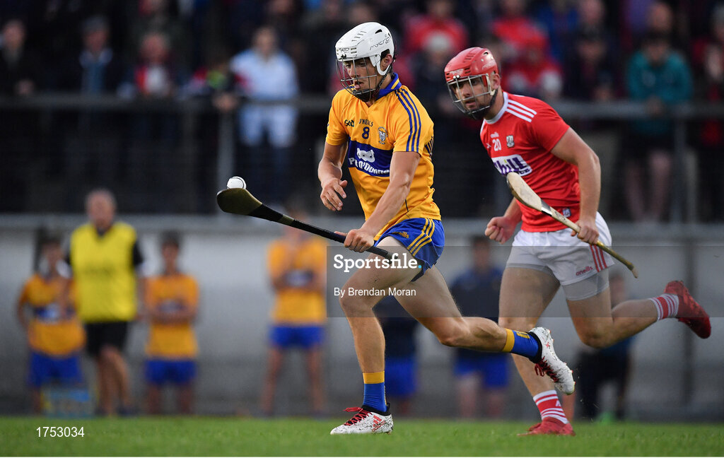 10 July 2019; Aidan McCarthy of Clare in action against Declan Hanlon of Cork during the Bord Gais Energy Munster GAA Hurling Under 20 Championship semi-final match between Cork and Clare at Páirc Ui Rinn in Cork. Photo by Brendan Moran/Sportsfile