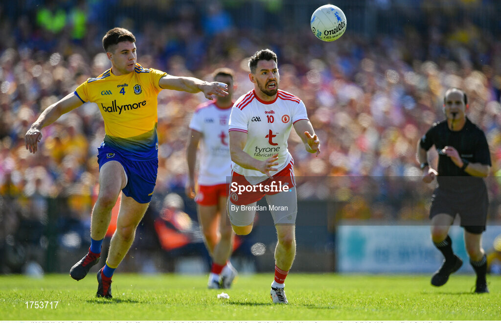 13 July 2019; Mattie Donnelly of Tyrone in action against Conor Daly of Roscommon during the GAA Football All-Ireland Senior Championship Quarter-Final Group 2 Phase 1 match between Roscommon and Tyrone at Dr Hyde Park in Roscommon. Photo by Brendan Moran/Sportsfile