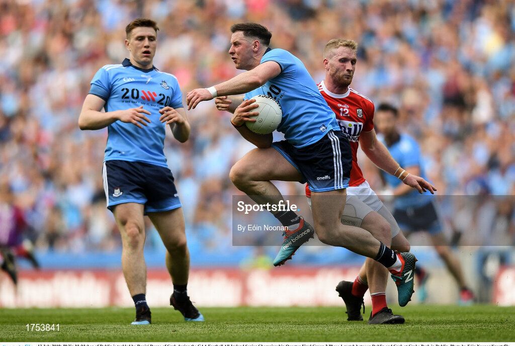 13 July 2019; Philip McMahon of Dublin is tackled by Ruairí Deane of Cork during the GAA Football All-Ireland Senior Championship Quarter-Final Group 2 Phase 1 match between Dublin and Cork at Croke Park in Dublin. Photo by Eóin Noonan/Sportsfile