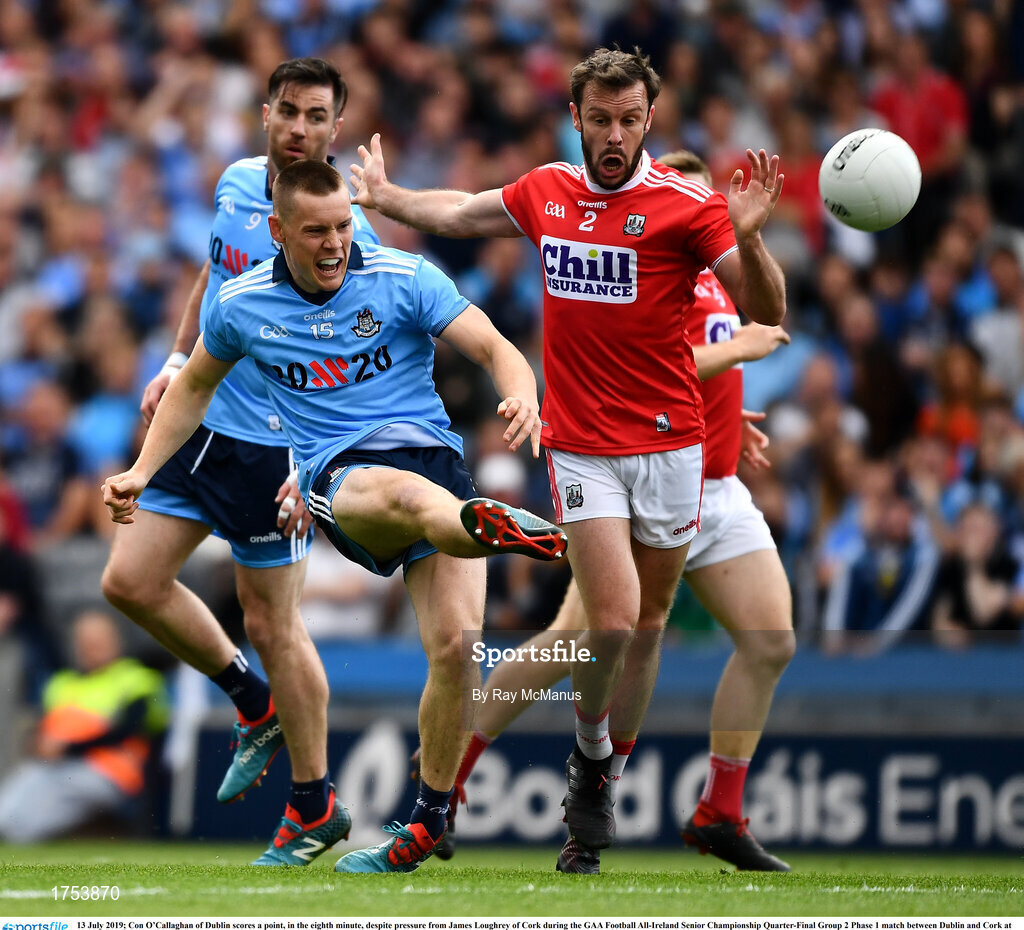 13 July 2019; Con O’Callaghan of Dublin scores a point, in the eighth minute, despite pressure from James Loughrey of Cork during the GAA Football All-Ireland Senior Championship Quarter-Final Group 2 Phase 1 match between Dublin and Cork at Croke Park in Dublin. Photo by Ray McManus/Sportsfile