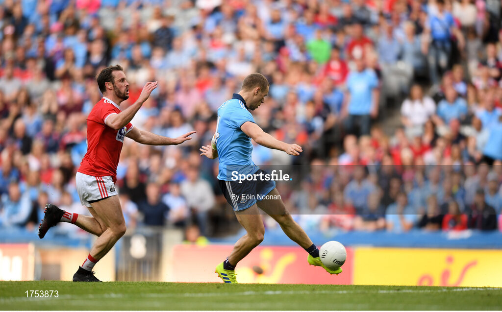 13 July 2019; Paul Mannion of Dublin has a shot on goal which hits the post during the GAA Football All-Ireland Senior Championship Quarter-Final Group 2 Phase 1 match between Dublin and Cork at Croke Park in Dublin. Photo by Eóin Noonan/Sportsfile