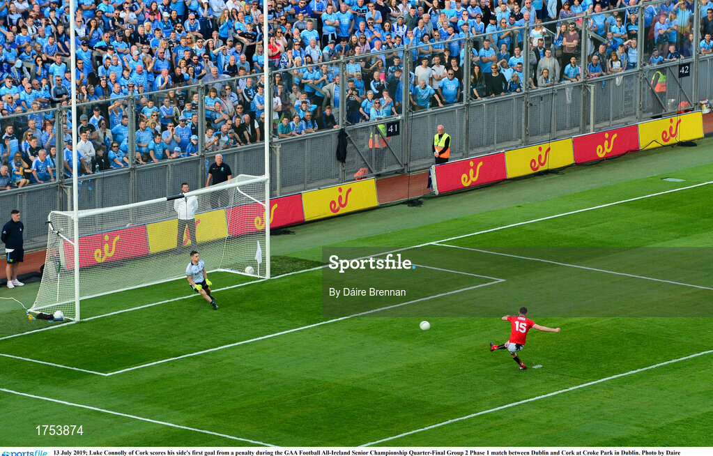 13 July 2019; Luke Connolly of Cork scores his side's first goal from a penalty during the GAA Football All-Ireland Senior Championship Quarter-Final Group 2 Phase 1 match between Dublin and Cork at Croke Park in Dublin. Photo by Daire Brennan/Sportsfile