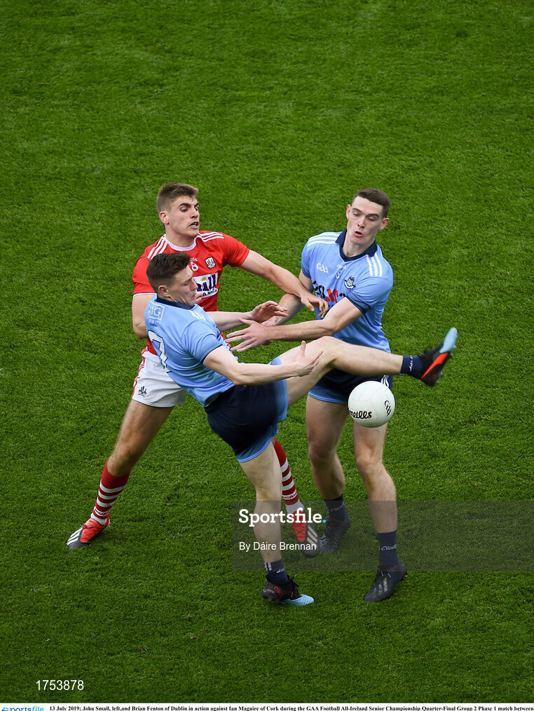 13 July 2019; John Small, left,and Brian Fenton of Dublin in action against Ian Maguire of Cork during the GAA Football All-Ireland Senior Championship Quarter-Final Group 2 Phase 1 match between Dublin and Cork at Croke Park in Dublin. Photo by Daire Brennan/Sportsfile