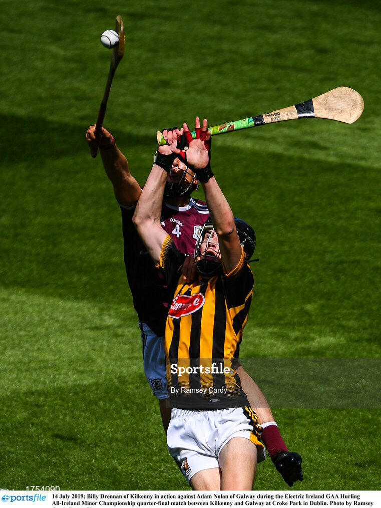 14 July 2019; Billy Drennan of Kilkenny in action against Adam Nolan of Galway during the Electric Ireland GAA Hurling All-Ireland Minor Championship quarter-final match between Kilkenny and Galway at Croke Park in Dublin. Photo by Ramsey Cardy/Sportsfile