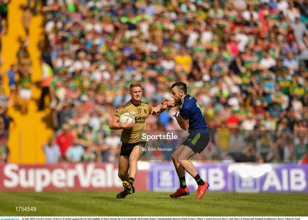 14 July 2019; Gavin Crowley of Kerry in action against Kevin McLoughlin of Mayo during the GAA Football All-Ireland Senior Championship Quarter-Final Group 1 Phase 1 match between Kerry and Mayo at Fitzgerald Stadium in Killarney, Kerry. Photo by Eóin Noonan/Sportsfile