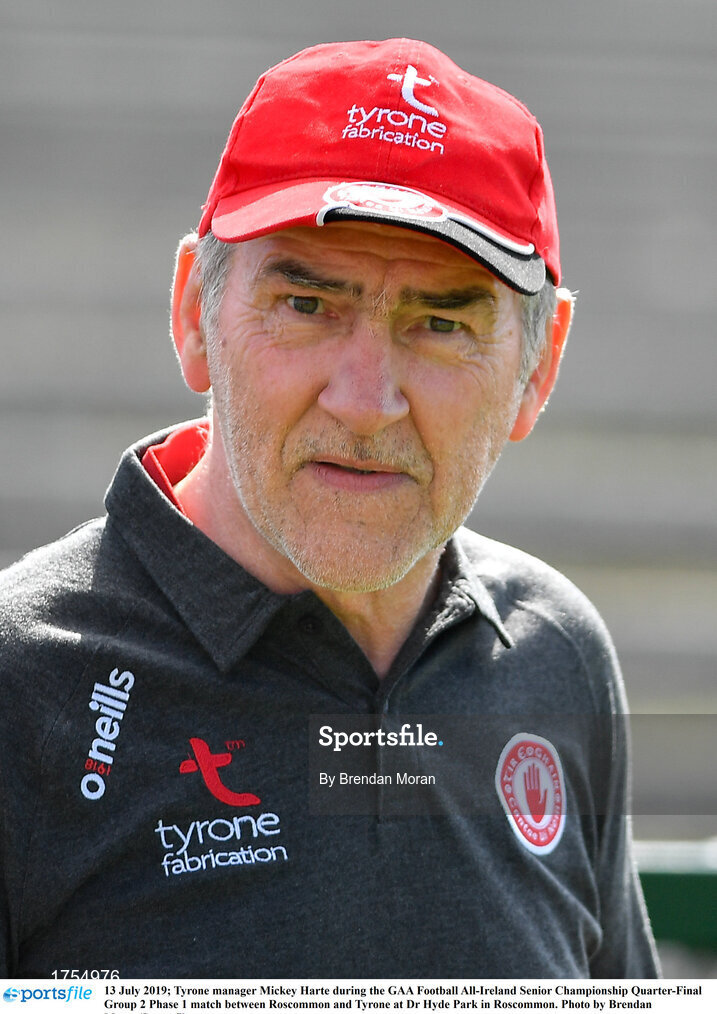 13 July 2019; Tyrone manager Mickey Harte during the GAA Football All-Ireland Senior Championship Quarter-Final Group 2 Phase 1 match between Roscommon and Tyrone at Dr Hyde Park in Roscommon. Photo by Brendan Moran/Sportsfile