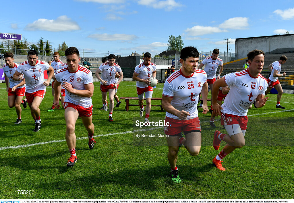 13 July 2019; The Tyrone players break away from the team photograph prior to the GAA Football All-Ireland Senior Championship Quarter-Final Group 2 Phase 1 match between Roscommon and Tyrone at Dr Hyde Park in Roscommon. Photo by Brendan Moran/Sportsfile