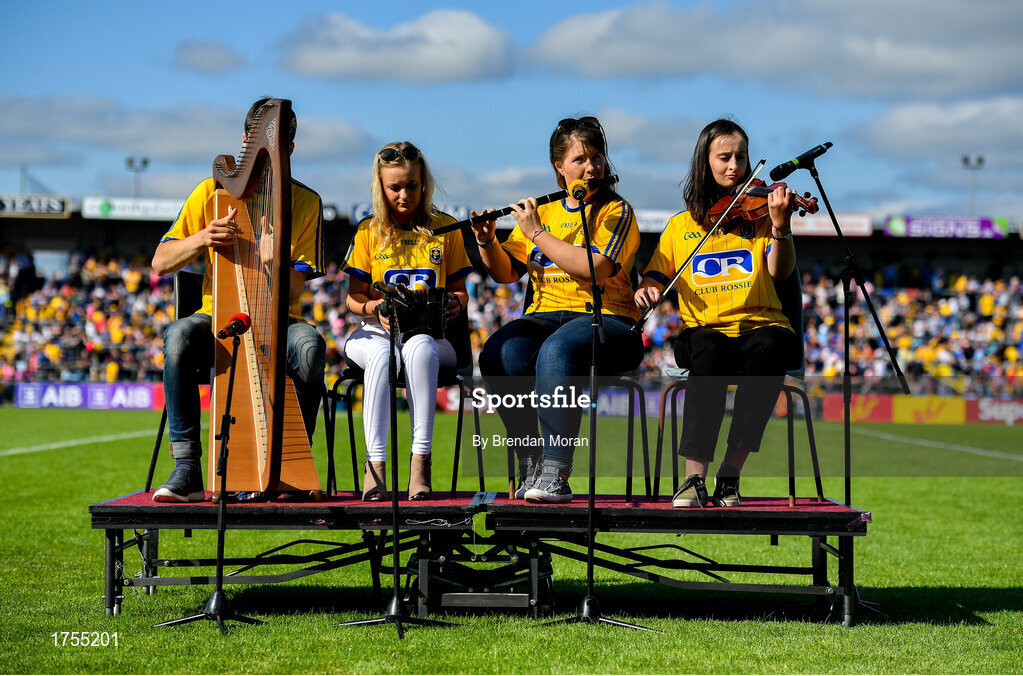 13 July 2019; The St Ronan's Scór Instrumental music group entertain the fans at half-time during the GAA Football All-Ireland Senior Championship Quarter-Final Group 2 Phase 1 match between Roscommon and Tyrone at Dr Hyde Park in Roscommon. Photo by Brendan Moran/Sportsfile