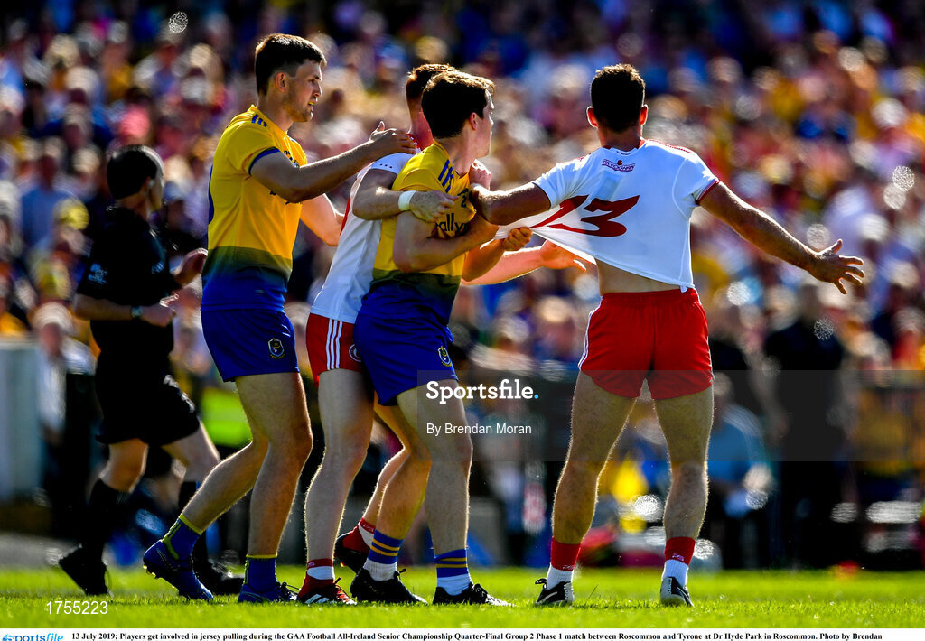 13 July 2019; Players get involved in jersey pulling during the GAA Football All-Ireland Senior Championship Quarter-Final Group 2 Phase 1 match between Roscommon and Tyrone at Dr Hyde Park in Roscommon. Photo by Brendan Moran/Sportsfile