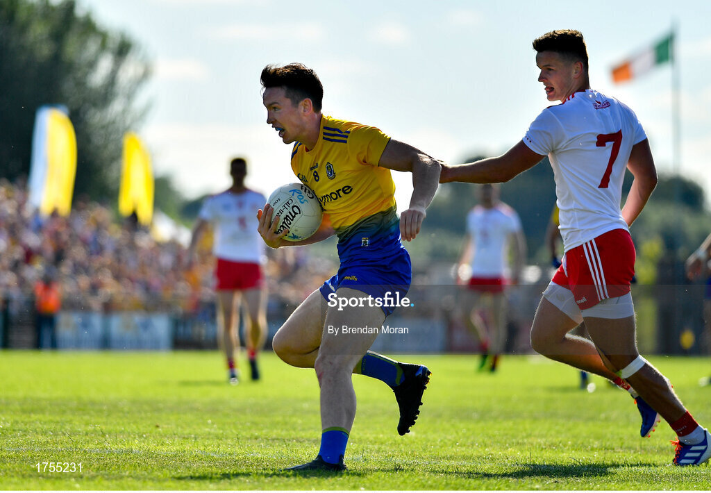 13 July 2019; Tadgh O'Rourke of Roscommon in action against Michael McKernan of Tyrone during the GAA Football All-Ireland Senior Championship Quarter-Final Group 2 Phase 1 match between Roscommon and Tyrone at Dr Hyde Park in Roscommon. Photo by Brendan Moran/Sportsfile