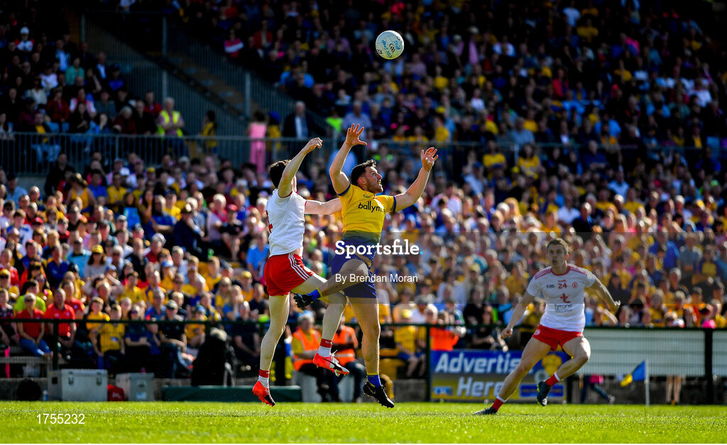 13 July 2019; Diarmuid Murtagh of Roscommon in action against Rory Brennan of Tyrone during the GAA Football All-Ireland Senior Championship Quarter-Final Group 2 Phase 1 match between Roscommon and Tyrone at Dr Hyde Park in Roscommon. Photo by Brendan Moran/Sportsfile