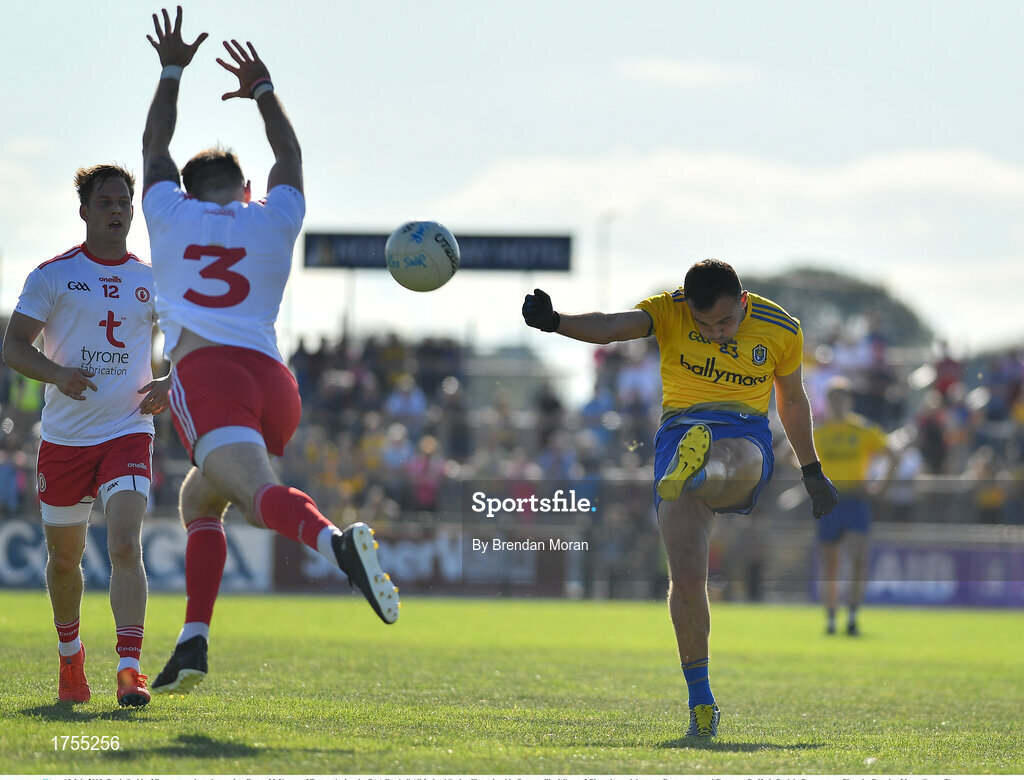 13 July 2019; Donie Smith of Roscommon in action against Ronan McNamee of Tyrone during the GAA Football All-Ireland Senior Championship Quarter-Final Group 2 Phase 1 match between Roscommon and Tyrone at Dr Hyde Park in Roscommon. Photo by Brendan Moran/Sportsfile