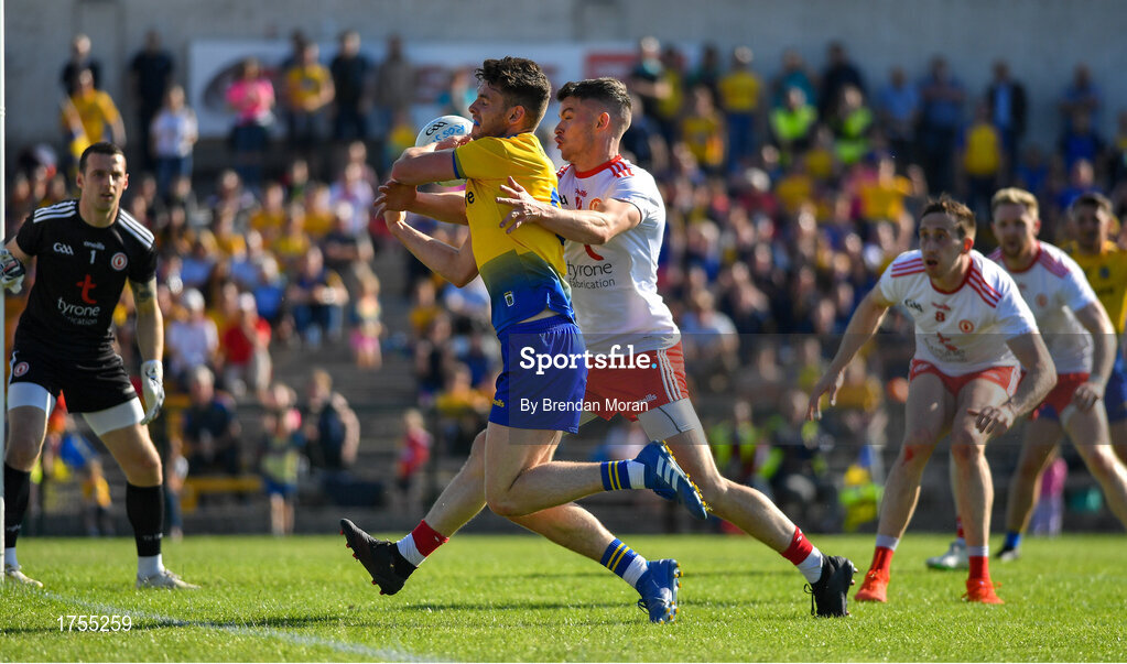 13 July 2019; Shane Killoran of Roscommon attempts to keep the ball in play despite the efforts of Richie Donnelly of Tyrone during the GAA Football All-Ireland Senior Championship Quarter-Final Group 2 Phase 1 match between Roscommon and Tyrone at Dr Hyde Park in Roscommon. Photo by Brendan Moran/Sportsfile