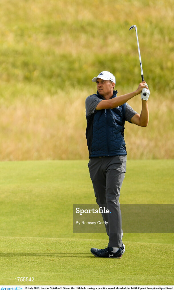 16 July 2019; Jordan Spieth of USA on the 18th hole during a practice round ahead of the 148th Open Championship at Royal Portrush in Portrush, Co. Antrim. Photo by Ramsey Cardy/Sportsfile