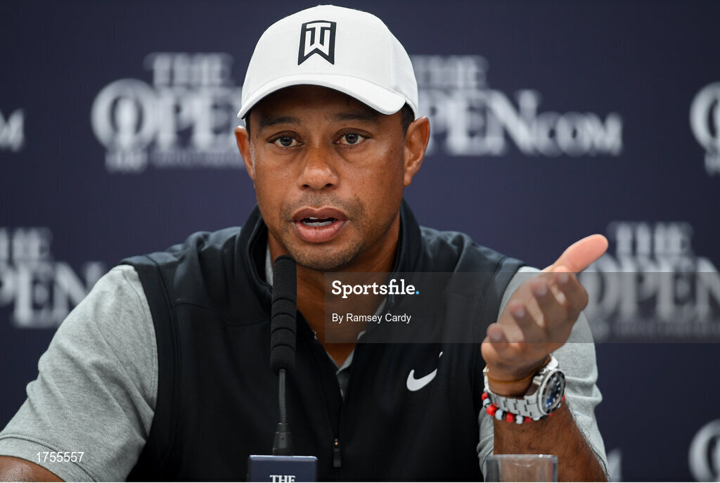 16 July 2019; Tiger Woods of USA during a press conference ahead of the 148th Open Championship at Royal Portrush in Portrush, Co. Antrim. Photo by Ramsey Cardy/Sportsfile