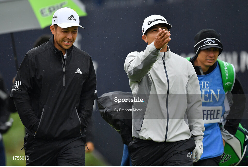 17 July 2019; Xander Schauffele of USA, left, with Kurt Kitayama of USA during a practice round ahead of the 148th Open Championship at Royal Portrush in Portrush, Co. Antrim. Photo by Brendan Moran/Sportsfile