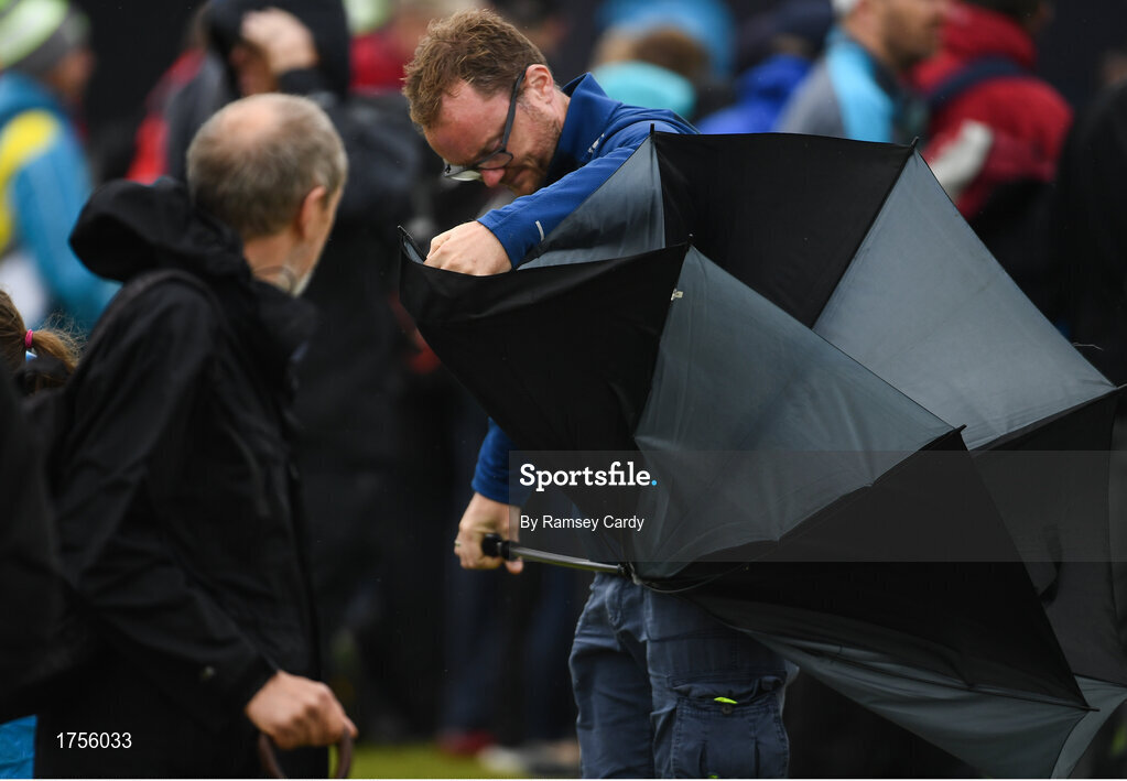 17 July 2019; A spectator has trouble with his umbrella during a practice round ahead of the 148th Open Championship at Royal Portrush in Portrush, Co. Antrim. Photo by Ramsey Cardy/Sportsfile