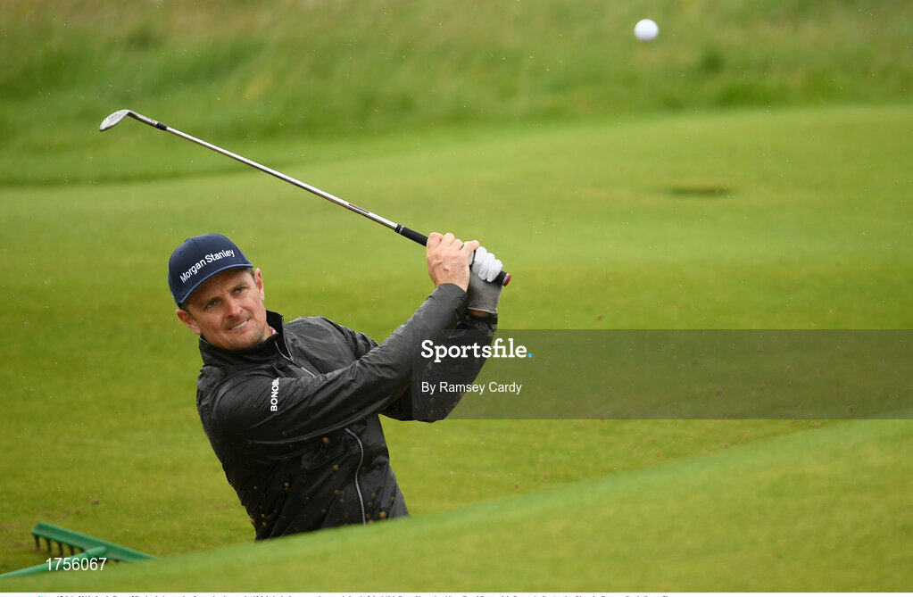 17 July 2019; Justin Rose of England plays a shot from a bunker on the 13th hole during a practice round ahead of the 148th Open Championship at Royal Portrush in Portrush, Co. Antrim. Photo by Ramsey Cardy/Sportsfile