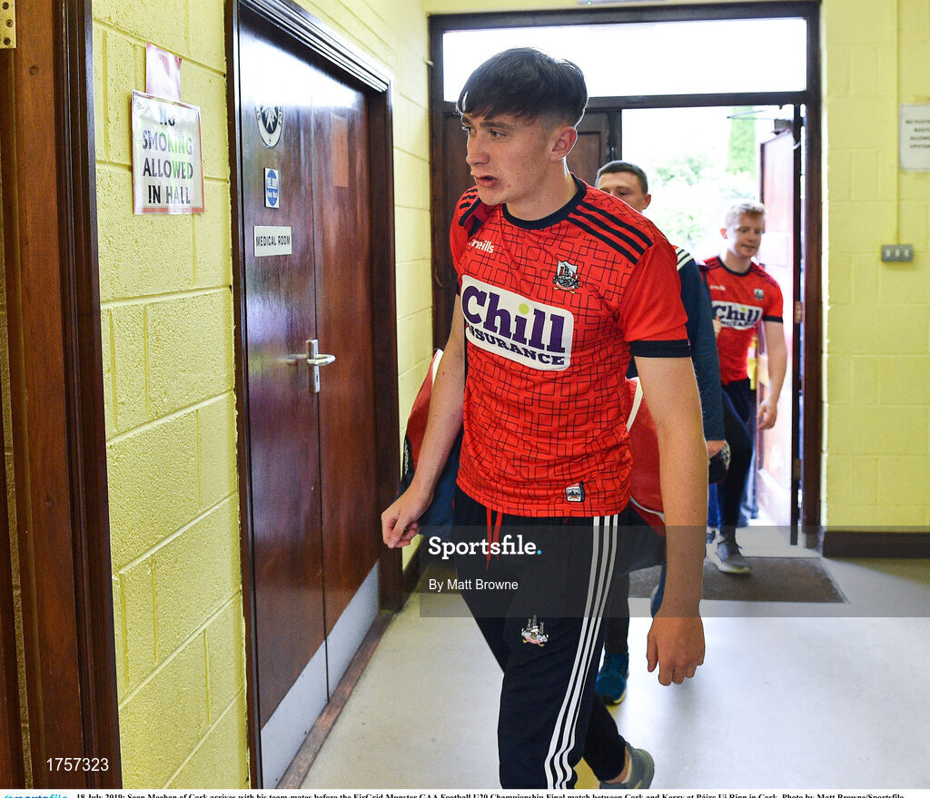 18 July 2019; Sean Meehan of Cork arrives with his team-mates before the EirGrid Munster GAA Football U20 Championship Final match between Cork and Kerry at Páirc Ui Rinn in Cork. Photo by Matt Browne/Sportsfile
