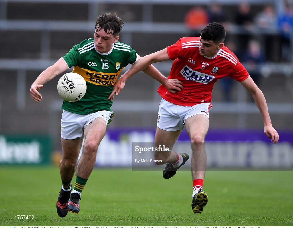 18 July 2019; Killian Falvey of Kerry in action against Michael O'Mahony of Cork during the EirGrid Munster GAA Football U20 Championship Final match between Cork and Kerry at Páirc Ui Rinn in Cork. Photo by Matt Browne/Sportsfile