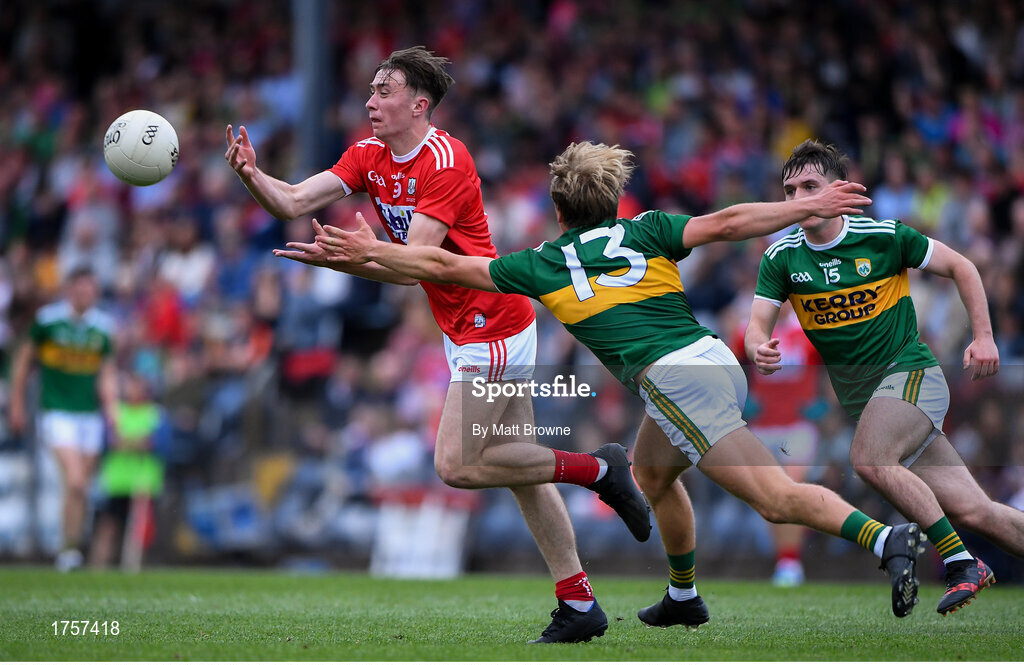 18 July 2019; Sean Meehan of Cork in action against Fiachra Clifford of Kerry during the EirGrid Munster GAA Football U20 Championship Final match between Cork and Kerry at Páirc Ui Rinn in Cork. Photo by Matt Browne/Sportsfile
