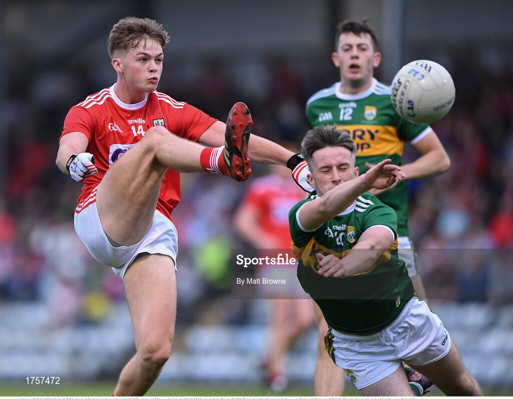 18 July 2019; Cathail O'Mahony of Cork in action against Chris O'Donoghue of Kerry during the EirGrid Munster GAA Football U20 Championship Final match between Cork and Kerry at Páirc Ui Rinn in Cork. Photo by Matt Browne/Sportsfile