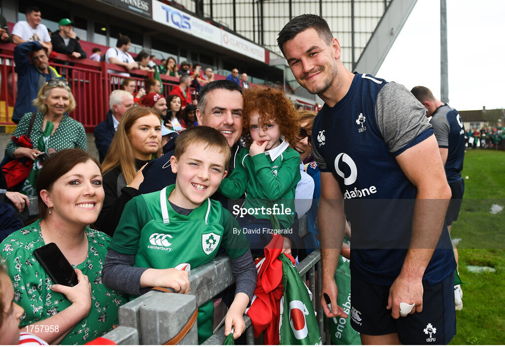 19 July 2019; Jonathan Sexton poses for a photo with fans following an Ireland Rugby open training session at Thomond Park in Limerick. Photo by David Fitzgerald/Sportsfile