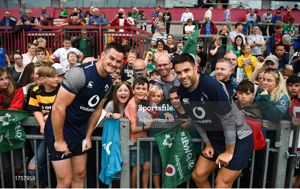 19 July 2019; Jonathan Sexton, left, and Conor Murray pose for a photo with fans following an Ireland Rugby open training session at Thomond Park in Limerick. Photo by David Fitzgerald/Sportsfile