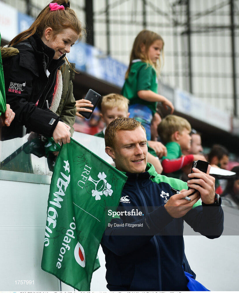19 July 2019; Keith Earls takes a selfie with a fan following an Ireland Rugby open training session at Thomond Park in Limerick. Photo by David Fitzgerald/Sportsfile