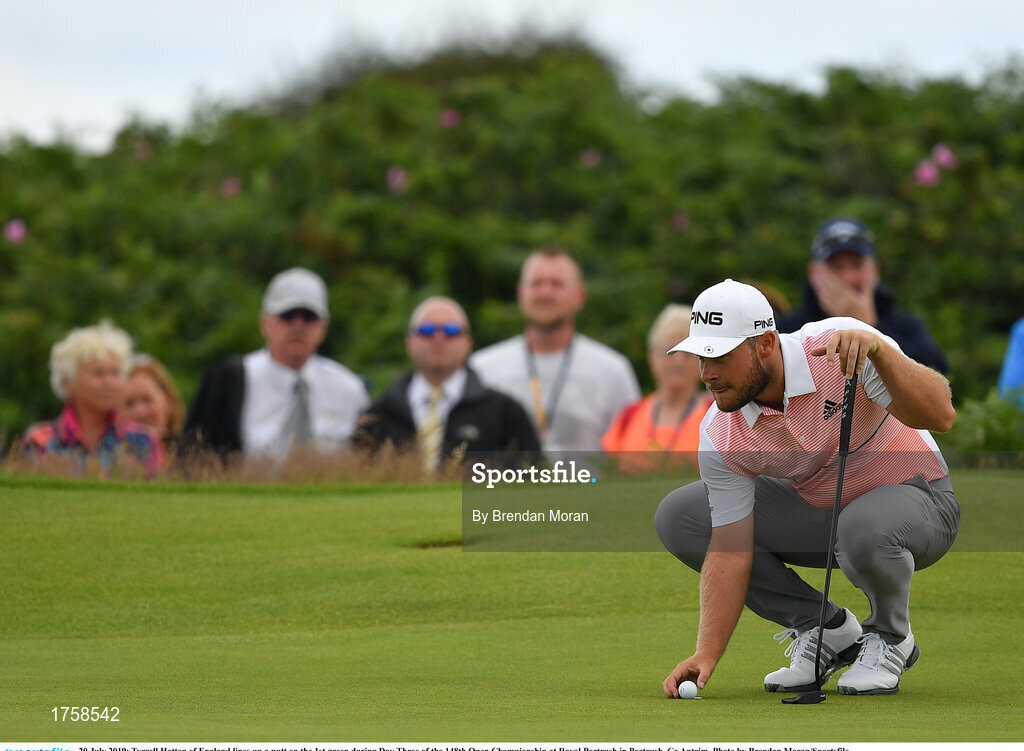 20 July 2019; Tyrrell Hatton of England lines up a putt on the 1st green during Day Three of the 148th Open Championship at Royal Portrush in Portrush, Co Antrim. Photo by Brendan Moran/Sportsfile
