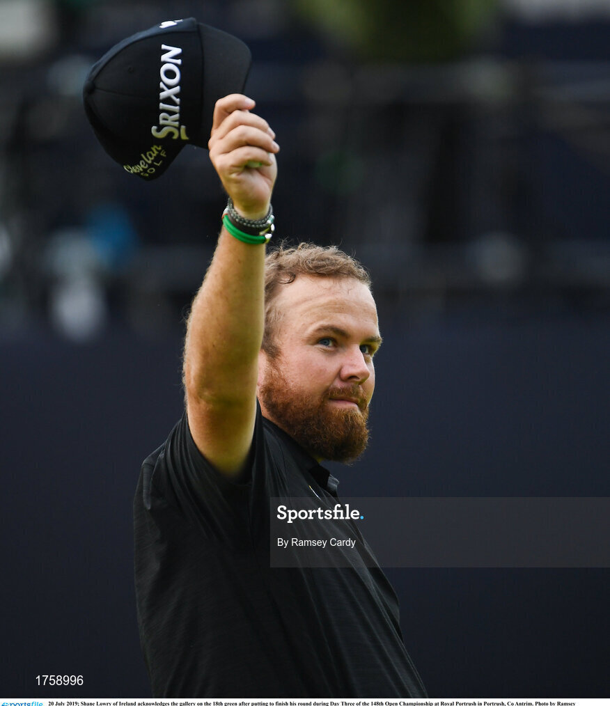 20 July 2019; Shane Lowry of Ireland acknowledges the gallery on the 18th green after putting to finish his round during Day Three of the 148th Open Championship at Royal Portrush in Portrush, Co Antrim. Photo by Ramsey Cardy/Sportsfile