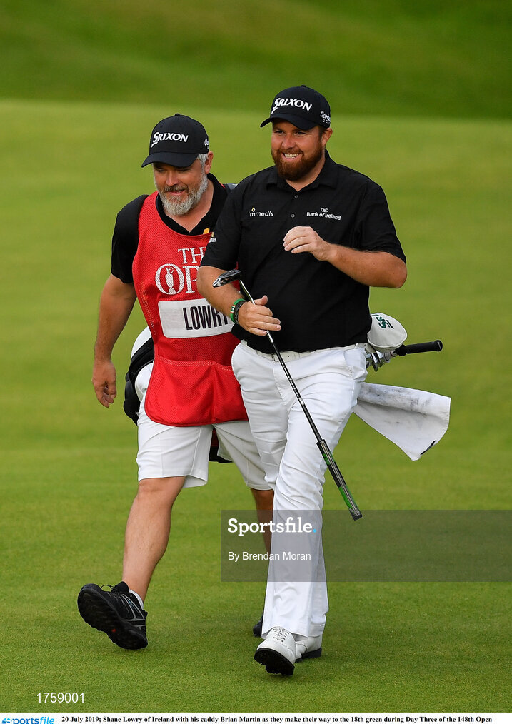 20 July 2019; Shane Lowry of Ireland with his caddy Brian Martin as they make their way to the 18th green during Day Three of the 148th Open Championship at Royal Portrush in Portrush, Co Antrim. Photo by Brendan Moran/Sportsfile