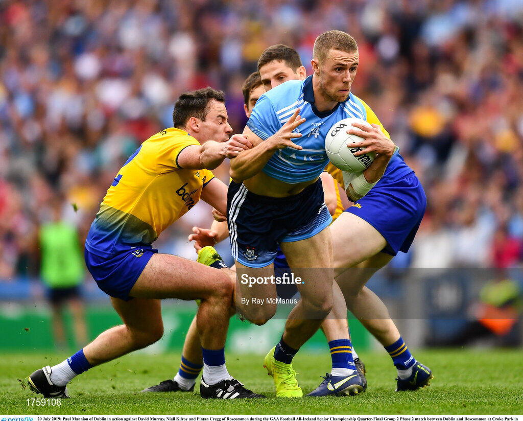 20 July 2019; Paul Mannion of Dublin in action against David Murray, Niall Kilroy and Fintan Cregg of Roscommon during the GAA Football All-Ireland Senior Championship Quarter-Final Group 2 Phase 2 match between Dublin and Roscommon at Croke Park in Dublin. Photo by Ray McManus/Sportsfile