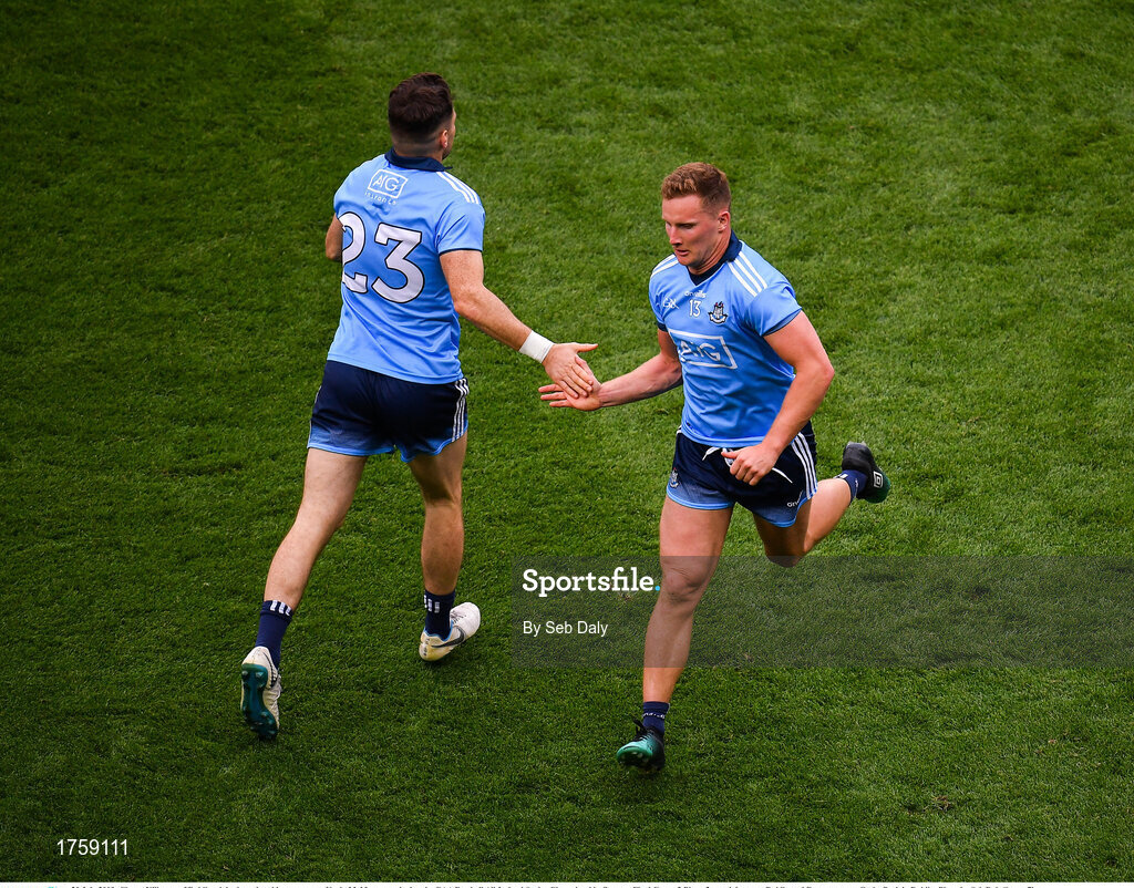 20 July 2019; Ciaran Kilkenny of Dublin, right, is replaced by team-mate Kevin McManamon during the GAA Football All-Ireland Senior Championship Quarter-Final Group 2 Phase 2 match between Dublin and Roscommon at Croke Park in Dublin. Photo by Seb Daly/Sportsfile