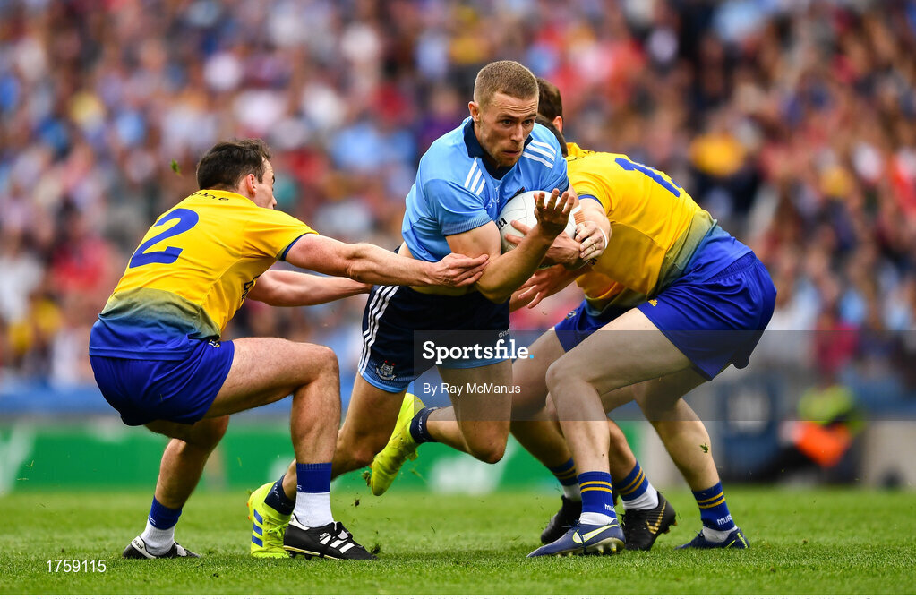 20 July 2019; Paul Mannion of Dublin in action against David Murray, Niall Kilroy and Fintan Cregg of Roscommon during the GAA Football All-Ireland Senior Championship Quarter-Final Group 2 Phase 2 match between Dublin and Roscommon at Croke Park in Dublin. Photo by Ray McManus/Sportsfile
