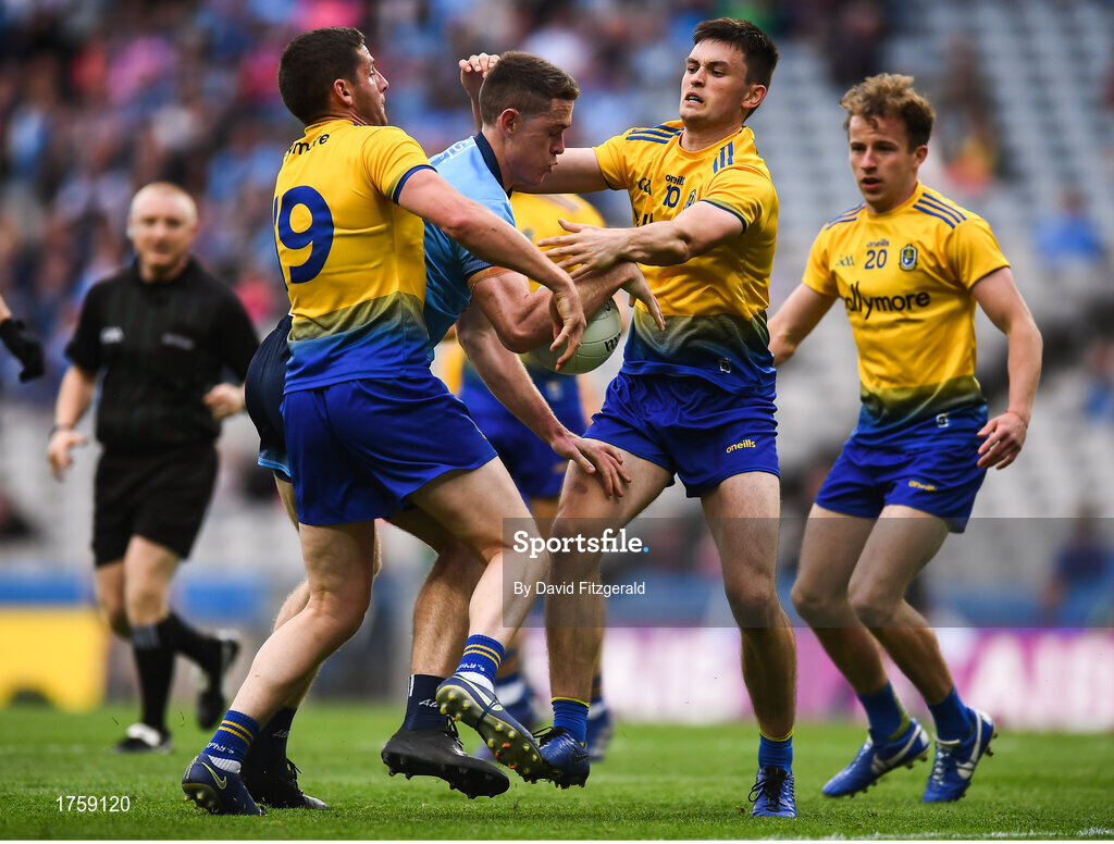 20 July 2019; Brian Fenton of Dublin in action against Roscommon players, from left, Shane Killoran, Brian Stack and Aengus Lyons during the GAA Football All-Ireland Senior Championship Quarter-Final Group 2 Phase 2 match between Dublin and Roscommon at Croke Park in Dublin. Photo by David Fitzgerald/Sportsfile