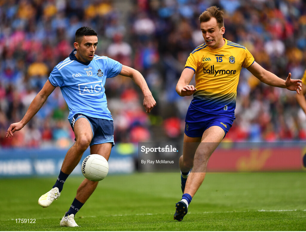 20 July 2019; Niall Scully of Dublin in action against Enda Smith of Roscommon during the GAA Football All-Ireland Senior Championship Quarter-Final Group 2 Phase 2 match between Dublin and Roscommon at Croke Park in Dublin. Photo by Ray McManus/Sportsfile