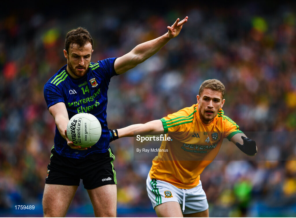 21 July 2019; Darren Coen of Mayo in action against Shane Gallagher of Meath during the GAA Football All-Ireland Senior Championship Quarter-Final Group 1 Phase 2 match between Mayo and Meath at Croke Park in Dublin. Photo by Ray McManus/Sportsfile