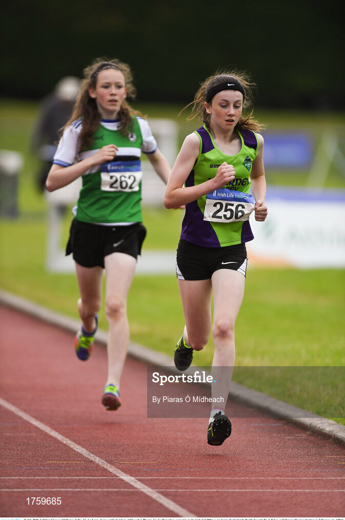 21 July 2019; Aoibhinn Gleeson of Killarney Valley AC, Co Kerry, front, and Katie Glynn of Monaghan Phoenix AC, Co Monaghan, competing in the Girls U14 800m event during the Irish Life Health Juvenile B’s & Relays at Tullamore Harriers Stadium in Tullamore, Co. Offaly. Photo by Piaras Ó Mídheach/Sportsfile