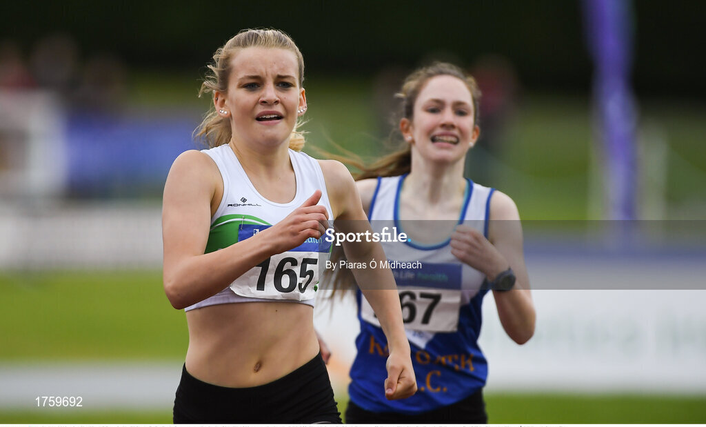 21 July 2019; Aine Sheridan of Carraig-Na-Bhfear AC, Co Cork, front, competing in the Girls U14 800m event during the Irish Life Health Juvenile B’s & Relays at Tullamore Harriers Stadium in Tullamore, Co. Offaly. Photo by Piaras Ó Mídheach/Sportsfile