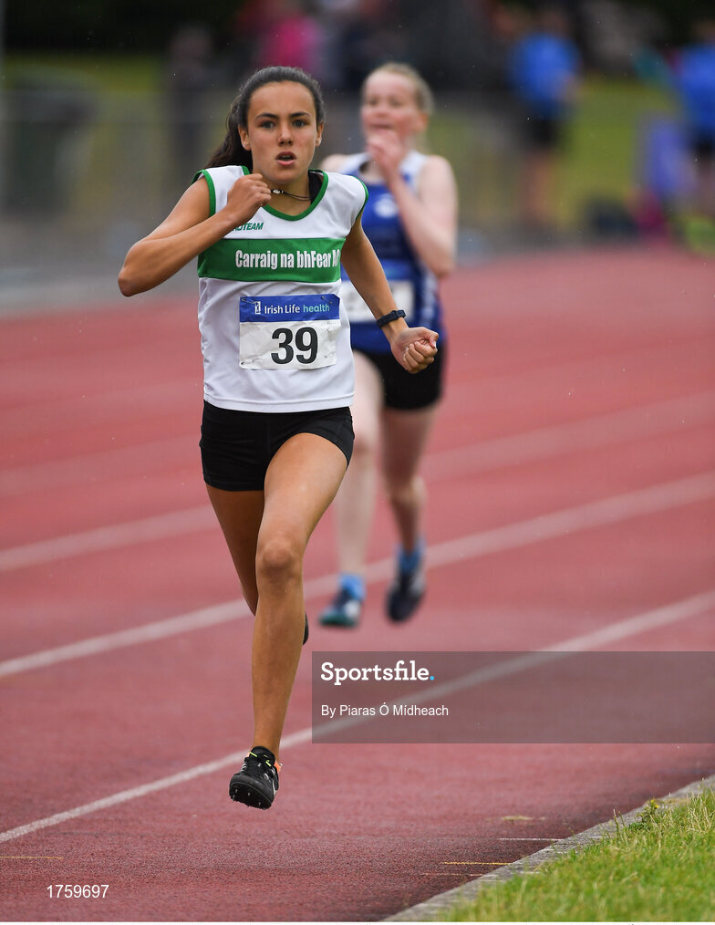 21 July 2019; Rebecca Kelleher of Carraig-Na-Bhfear AC, Co Cork, competing in the Girls U15 800m event during the Irish Life Health Juvenile B’s & Relays at Tullamore Harriers Stadium in Tullamore, Co. Offaly. Photo by Piaras Ó Mídheach/Sportsfile