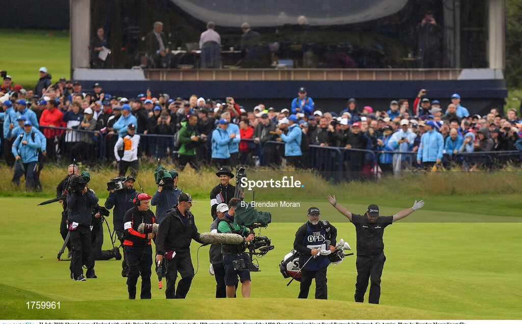 21 July 2019; Shane Lowry of Ireland with caddy Brian Martin makes his way to the 18th green during Day Four of the 148th Open Championship at Royal Portrush in Portrush, Co Antrim. Photo by Brendan Moran/Sportsfile