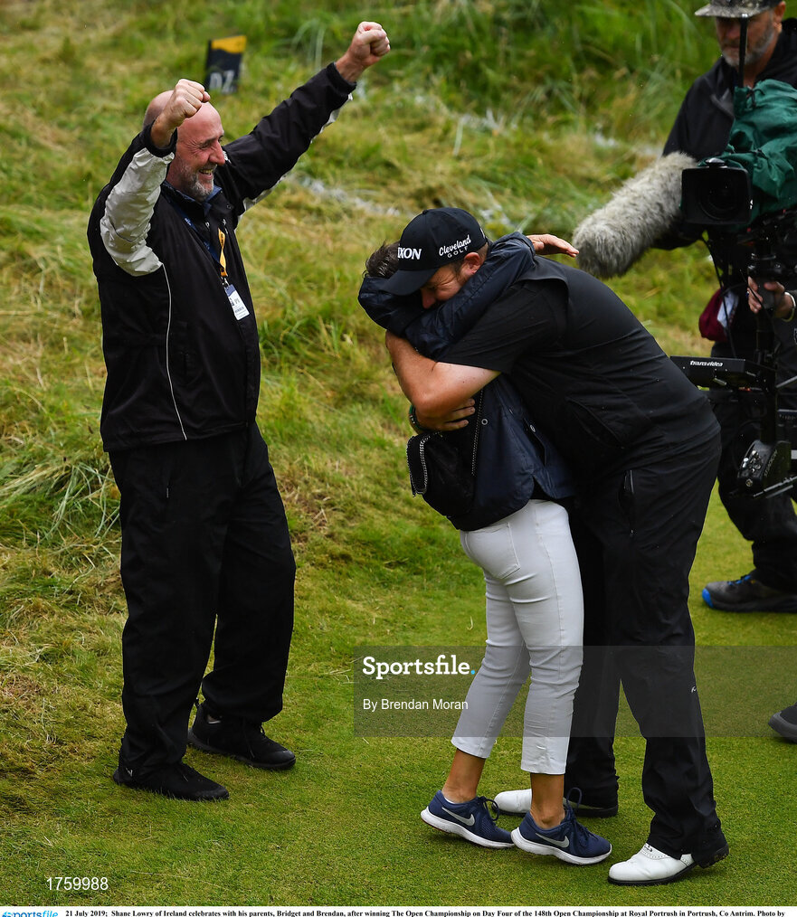 21 July 2019; Shane Lowry of Ireland celebrates with his parents, Bridget and Brendan, after winning The Open Championship on Day Four of the 148th Open Championship at Royal Portrush in Portrush, Co Antrim. Photo by Brendan Moran/Sportsfile