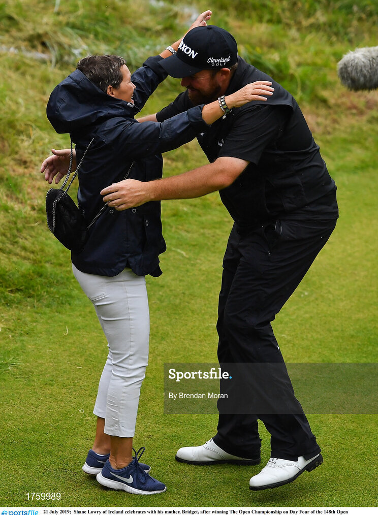 21 July 2019; Shane Lowry of Ireland celebrates with his mother, Bridget, after winning The Open Championship on Day Four of the 148th Open Championship at Royal Portrush in Portrush, Co Antrim. Photo by Brendan Moran/Sportsfile
