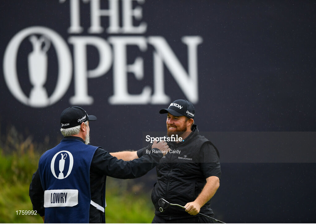 21 July 2019; Shane Lowry of Ireland celebrates with his caddy Brian Martin after winning The Open Championship on Day Four of the 148th Open Championship at Royal Portrush in Portrush, Co Antrim. Photo by Ramsey Cardy/Sportsfile